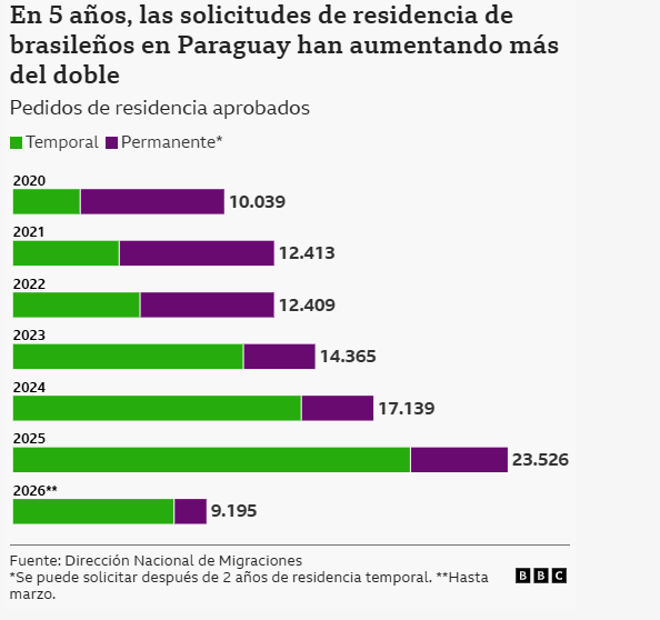 Según datos oficiales, en 2025 Paraguay otorgó más de 40.000 residencias a extranjeros, de las cuales más de la mitad correspondieron a brasileños. En los primeros meses de 2026, la cifra ya supera las 9.000 solicitudes, consolidando una migración en crecimiento.