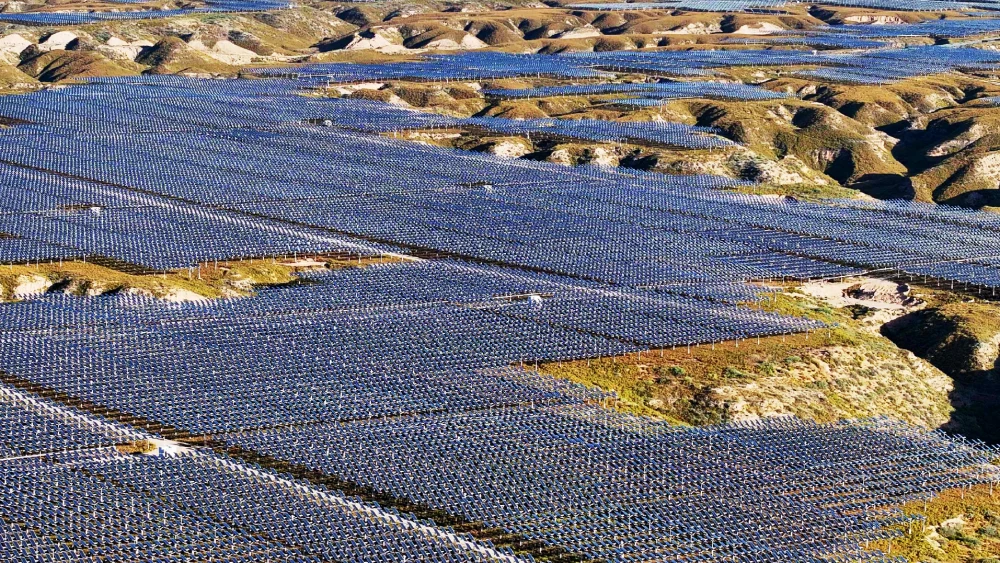 En Mongolia Interior, un mar de paneles azules se extiende por las dunas, adaptándose al relieve como olas en el desierto, marcando el avance de China hacia la energía limpia.