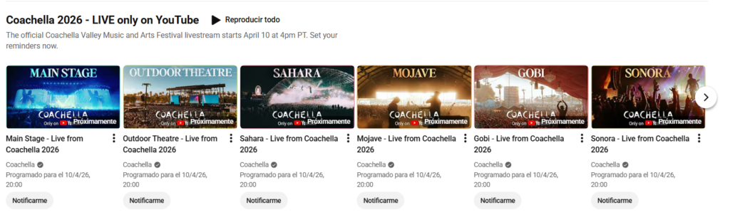 YouTube emitirá el festival a partir de las 19:00 (hora del Este de EE.UU.) durante el primer fin de semana (10, 11 y 12 de abril) y repetirá la cobertura el 17, 18 y 19 de abril. Aunque las entradas están agotadas, la transmisión oficial permitirá seguir los shows en tiempo real y activar notificaciones por artista o escenario.