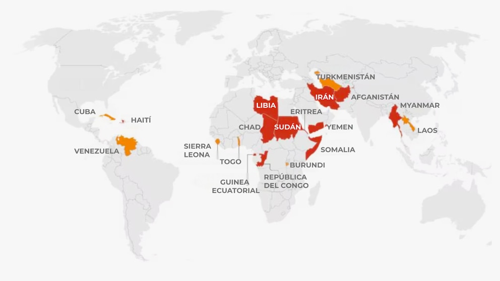 La medida impide la emisión de nuevos visados a personas originarias de 12 países, entre ellos Afganistán, Irán, Libia, Yemen, Somalia y Sudán. Además, impone restricciones adicionales a ciudadanos de otras siete naciones, como Cuba, Venezuela, Burundi y Turkmenistán.