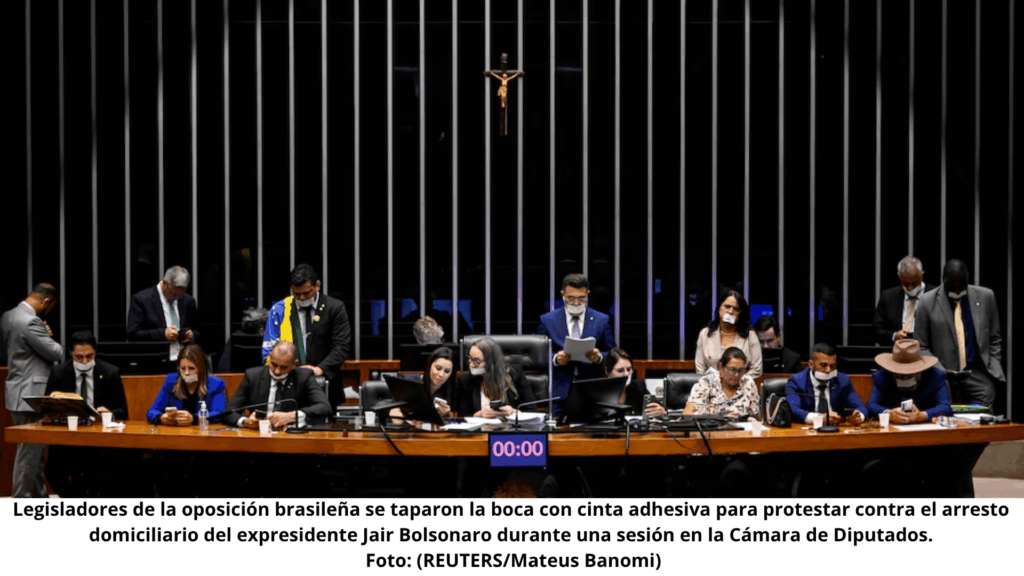 En señal de protesta, diputados del PL y partidos aliados permanecieron en el hemiciclo con la boca tapada con cinta adhesiva, denunciando lo que califican como censura judicial contra el exmandatario.