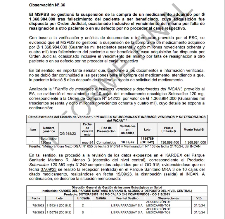 El informe, de 235 páginas, expone múltiples irregularidades. Entre ellas, se reporta el vencimiento de fármacos por un monto de G. 5.497.255.313 (aproximadamente USD 746.909), medicamentos que nunca fueron utilizados ni redistribuidos.