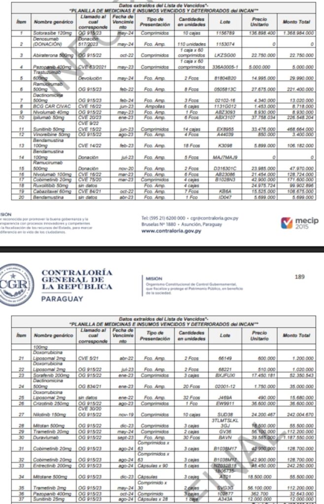 El reporte también detalla la distribución irregular de medicamentos oncológicos desde el Incan hacia centros privados como el Centro Médico Nuestra Señora de la Asunción (USD 239.563), entre otros que se habrían beneficiado sin autorización ni devolución.