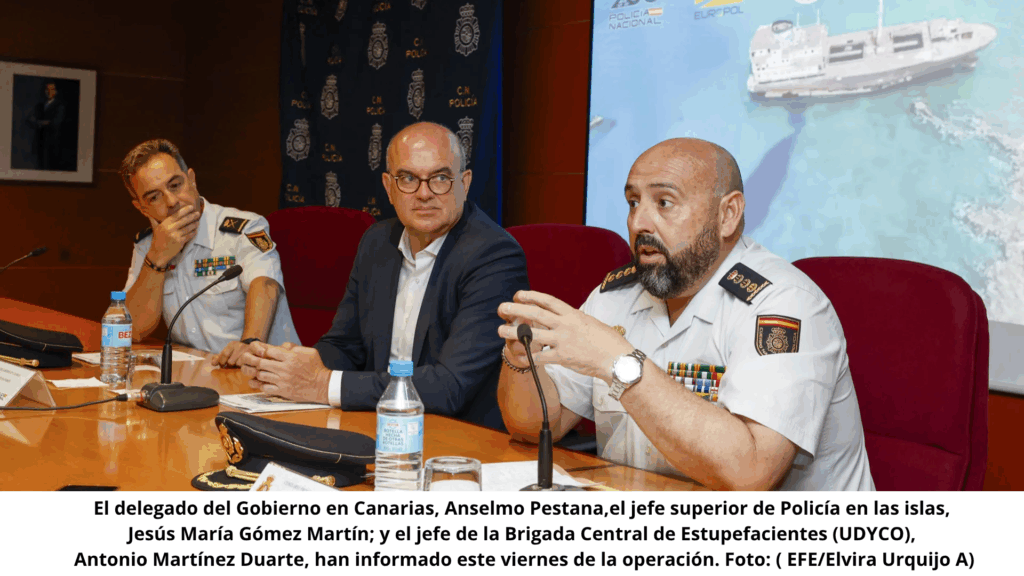 El anuncio fue hecho por el delegado del Gobierno en Canarias, Anselmo Pestana, el jefe superior de Policía en las islas, Jesús María Gómez Martín, y el jefe de la Brigada Central de Estupefacientes (UDYCO), Antonio Martínez Duarte, quienes destacaron el alcance internacional y la complejidad logística de la operación.
