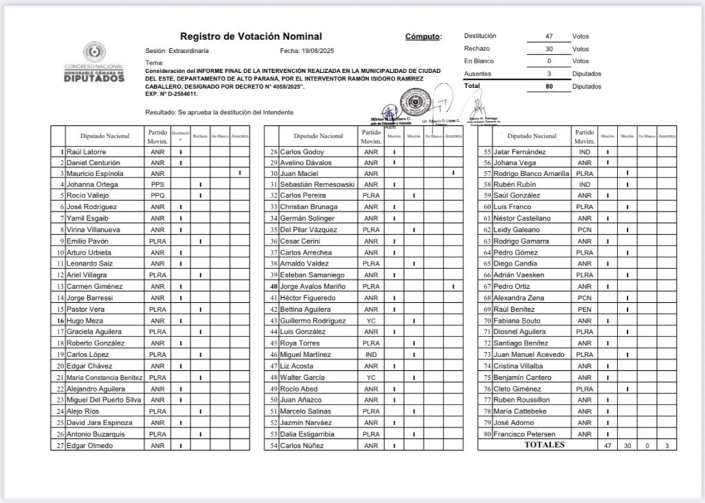 La Cámara de Diputados de Paraguay aprobó este martes la destitución del intendente de Ciudad del Este, Miguel Prieto, líder del movimiento “YoCreo”, tras debatir el informe de intervención presentado por el interventor Ramón Ramírez.
