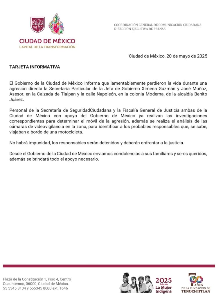 Mientras tanto, en la sede del gobierno capitalino se respira un ambiente de consternación. Los colaboradores de Brugada han expresado su indignación y tristeza. El doble asesinato no solo enluta a su equipo, sino que deja al descubierto las vulnerabilidades que aún enfrenta la clase política en el país.