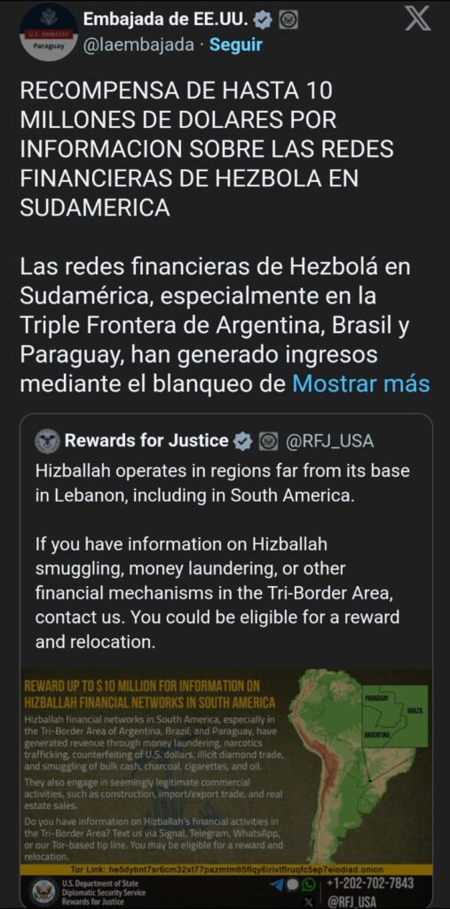 “¿Tienes información sobre las actividades financieras de Hezbolá en la Triple Frontera? Contáctanos de forma segura”, señala el anuncio difundido por canales como WhatsApp, Signal y Telegram. Las autoridades norteamericanas aseguran que la información será tratada con confidencialidad y que los informantes podrían ser elegibles para recibir la recompensa.
