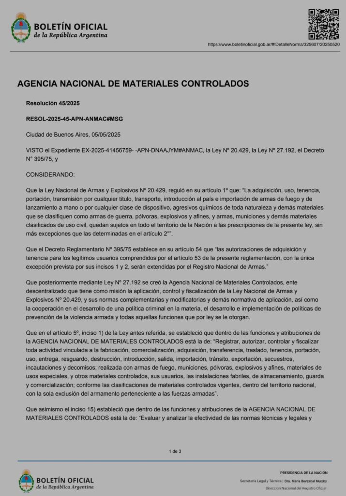 A principios de mayo, el Gobierno también anunció la eliminación de una serie de requisitos para comerciantes de armas y municiones, a través de la Resolución 49/2025. Entre ellos, ya no será necesario contar con habilitaciones municipales ni inscribirse ante la ANMaC para ejercer actividades comerciales en el rubro.