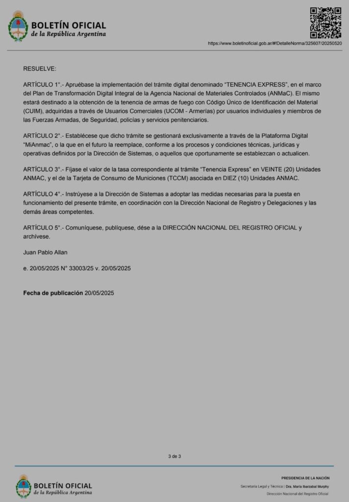 La medida fue firmada por el director ejecutivo de la ANMaC, Juan Pablo Allan, y contempla el uso exclusivo de la plataforma digital “MiAnmac”. Allí, los solicitantes podrán tramitar la tenencia y la Tarjeta de Consumo de Municiones (TCCM), con la integración de pagos y credenciales a través de la aplicación “MiArgentina”.