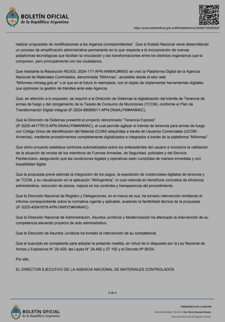 El Gobierno argentino habilitó un nuevo trámite digital llamado “Tenencia Express” que permite gestionar permisos para portar armas de fuego desde cualquier lugar con conexión a internet. La iniciativa, que se enmarca dentro del Plan de Transformación Digital Integral de la Agencia Nacional de Materiales Controlados (ANMaC), apunta a facilitar los procesos de obtención y validación de armas, según lo establecido en la Resolución 45/2025 publicada en el Boletín Oficial.