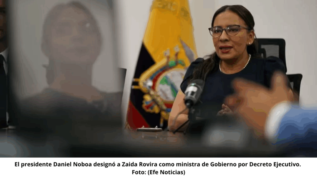 El presidente de Ecuador, Daniel Noboa, oficializó este martes la designación de Zaida Rovira como nueva ministra de Gobierno, en reemplazo de José De la Gasca, quien presentó su renuncia a través de una carta dirigida al mandatario. La decisión fue comunicada mediante decreto ejecutivo, en el cual también se agradeció al funcionario saliente por los servicios prestados durante su gestión.