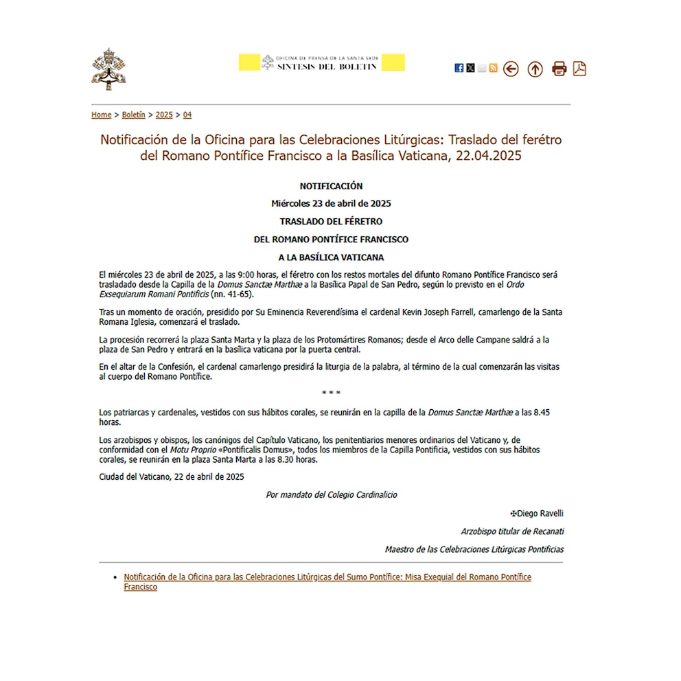 El miércoles 23 de abril, a las 9:00 horas (07:00 GMT), comenzará el traslado del cuerpo del papa Francisco desde la capilla de la residencia Santa Marta, donde falleció el lunes 21 de abril a los 88 años a causa de un ictus. La procesión, encabezada por el cardenal Kevin Joseph Farrell, recorrerá la Plaza Santa Marta, la Plaza de los Protomártires Romanos y, a través del Arco de las Campanas, llegará a la Plaza de San Pedro, ingresando al templo por la puerta principal.