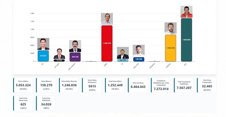 Los resultados preliminares provienen del Sistema de Resultados Preliminares (Sirepre) del Tribunal Supremo Electoral (TSE), basado en actas digitalizadas. Si bien no son vinculantes ni definitivos, ofrecen una fotografía clara del escenario electoral. El vocal Gustavo Ávila aclaró que su único fin es informar, sin sustituir el cómputo oficial.