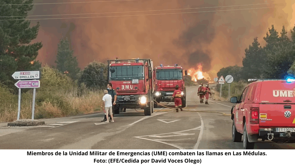 La situación se repite en varios puntos del país. En Castilla y León, la comunidad más extensa de España, el lunes se registraron más de 30 incendios forestales activos, entre ellos uno que amenaza Las Médulas, sitio Patrimonio Mundial por sus antiguas minas romanas.