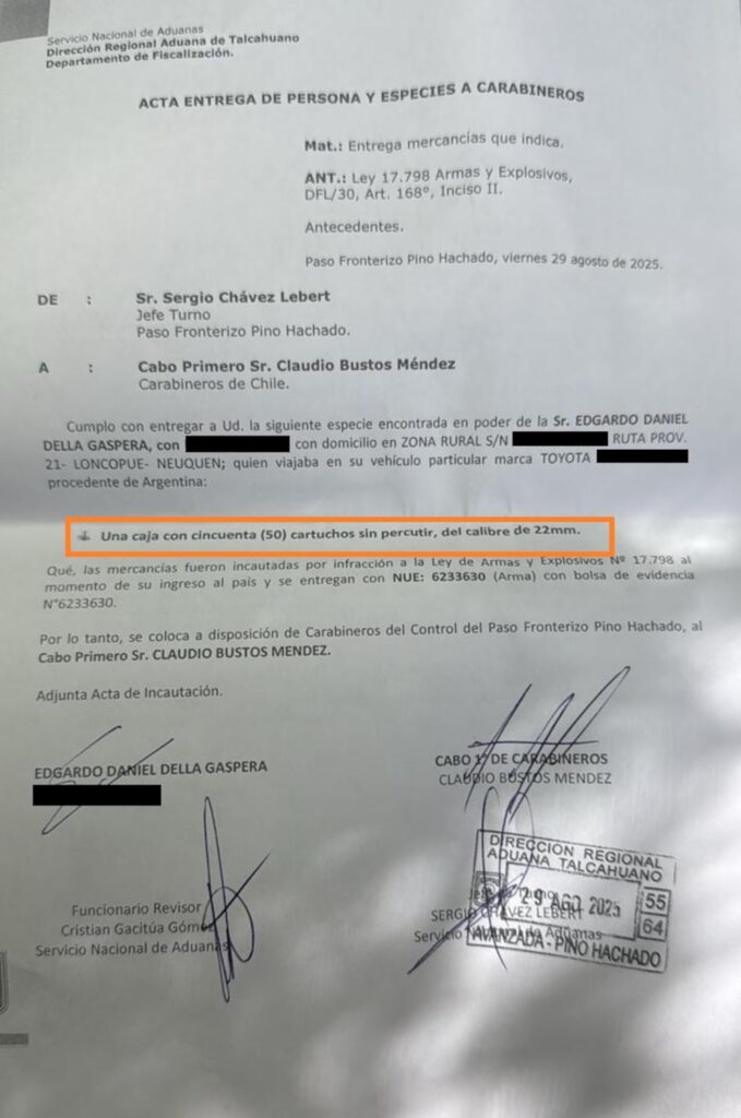 La justicia chilena formalizó este fin de semana al exlegislador provincial de Neuquén, Edgardo Della Gáspera, por su implicación en un caso de contrabando de municiones. El exdiputado fue interceptado por Carabineros en el control fronterizo del Paso Pino Hachado, ubicado en la región de La Araucanía, cuando intentaba ingresar a Chile con municiones ocultas sin declarar.