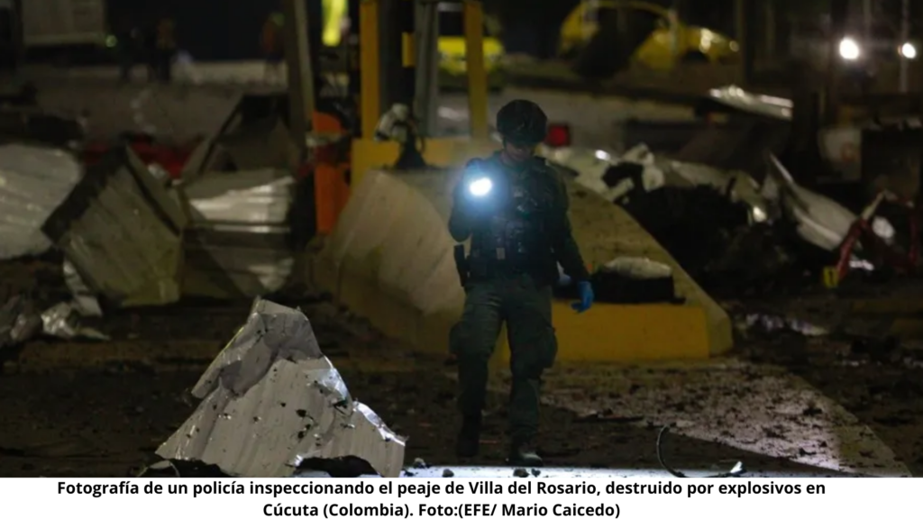 El peaje, un importante punto de control en la autopista internacional que conecta a Cúcuta con San Antonio del Táchira, quedó completamente destruido tras la explosión. El ataque también incluyó tiroteos contra varios puestos policiales cercanos, entre ellos el Templo Histórico y la estación de Policía de La Parada. Ninguna autoridad ha confirmado oficialmente la autoría de los ataques, pero se sospecha que la guerrilla del Ejército de Liberación Nacional (ELN) podría estar detrás de estos actos de violencia.