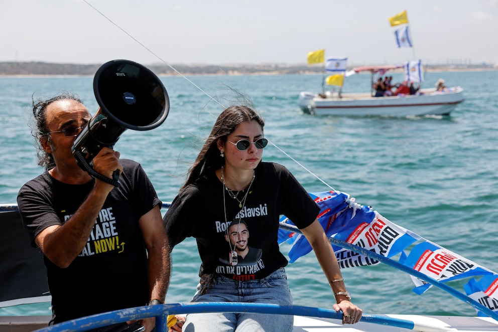 Más de veinte personas —familiares de rehenes israelíes— impulsaron una flotilla desde Ashkelon rumbo a la costa de Gaza, ondeando banderas amarillas y carteles con rostros de sus seres queridos, mientras gritaban sus nombres.
