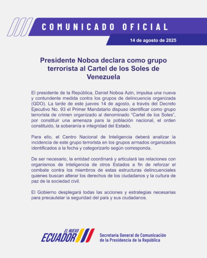 El presidente ecuatoriano, Daniel Noboa, oficializó este jueves la inclusión del Cartel de los Soles en la lista de organizaciones terroristas con influencia en el país, a través de un decreto ejecutivo que ordena al Centro Nacional de Inteligencia (CNI) investigar sus presuntos vínculos con bandas criminales locales. La decisión se enmarca en el conflicto armado interno declarado por el mandatario a inicios de 2024.