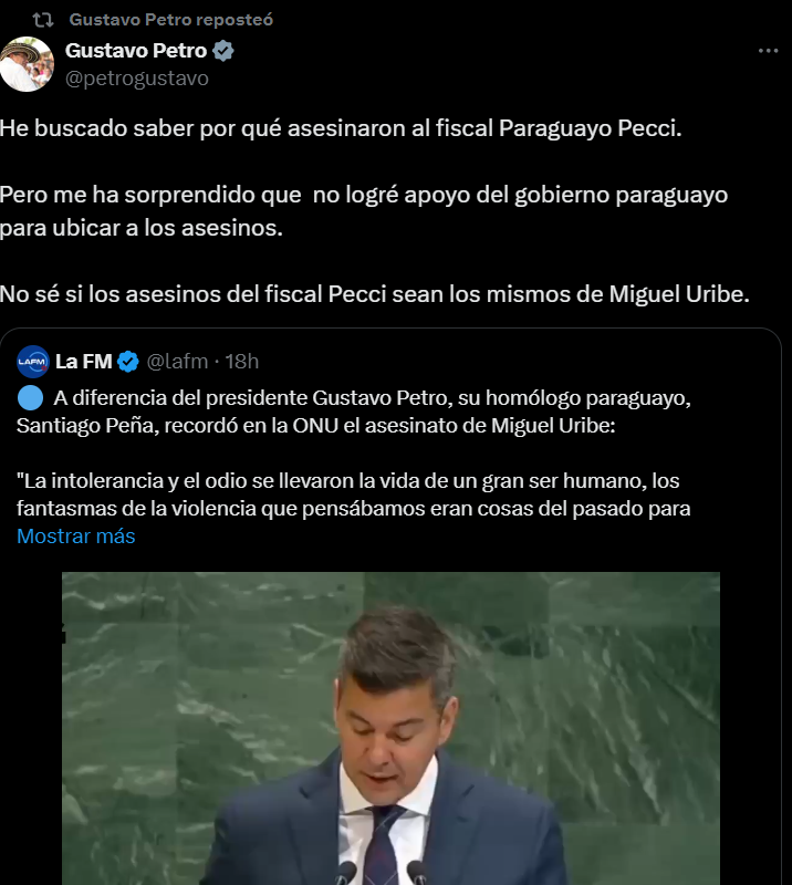 Petro, en respuesta, afirmó que pese a haber buscado la verdad sobre el crimen de Pecci, no encontró voluntad de cooperación por parte de Paraguay. “No logré apoyo del Gobierno paraguayo para ubicar a los asesinos”, escribió en la red social.
