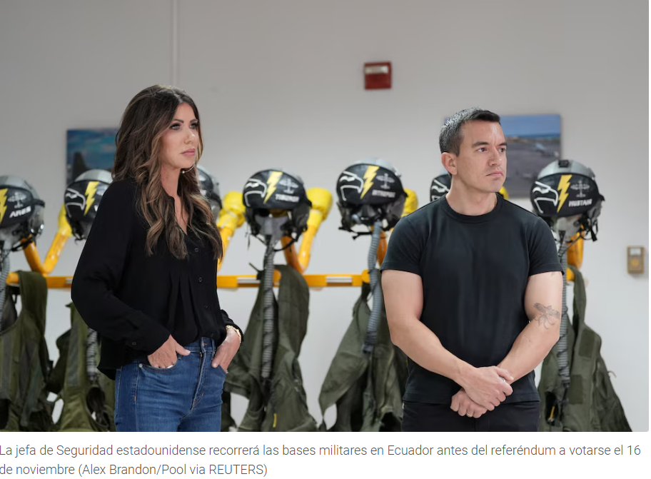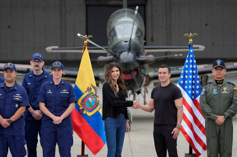 La secretaría de Seguridad Nacional de Estados Unidos, Kristi Noem, se reunió con el presidente ecuatoriano Daniel Noboa en la ciudad costera de Manta para inspeccionar las capacidades de la antigua base militar, utilizada por EE. UU. entre 1999 y 2009.