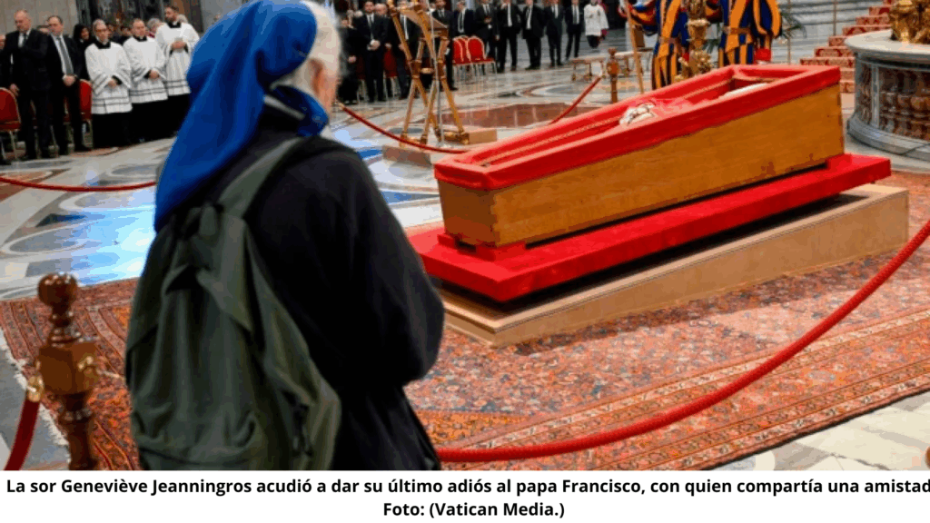 En medio de la ceremonia fúnebre del Papa Francisco, una figura se destacó en la plaza: Sor Geneviève Jeanningros, una religiosa francesa de 81 años, se aproximó al féretro y permaneció en silencio, desafiando el protocolo que reservaba ese espacio a cardenales y obispos.