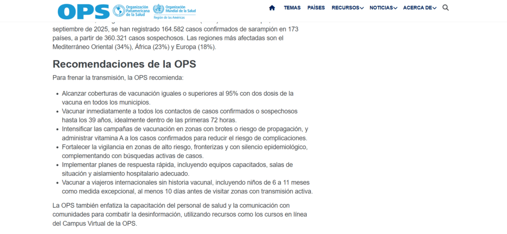 Entre las recomendaciones clave de la OPS para contener el brote, se incluye alcanzar una cobertura mínima del 95% con dos dosis de la vacuna contra el sarampión, reforzar la vigilancia epidemiológica en zonas fronterizas y suministrar vitamina A a los pacientes para disminuir complicaciones severas.