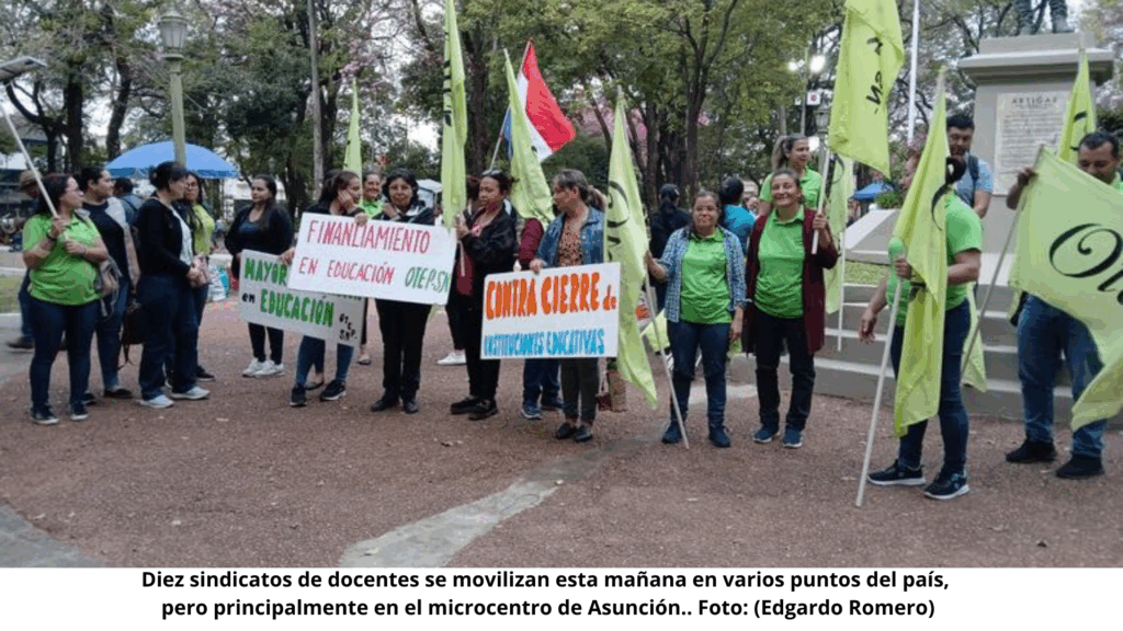 La jornada escolar de este lunes se vio interrumpida casi por completo en el sector público, debido a una protesta nacional protagonizada por docentes de todo el país. Según estimaciones iniciales de los gremios, cerca del 98% de los profesores no acudieron a las aulas, sumándose a una movilización que tuvo su epicentro en el microcentro de Asunción, pero que también se replicó en diversos puntos del interior.