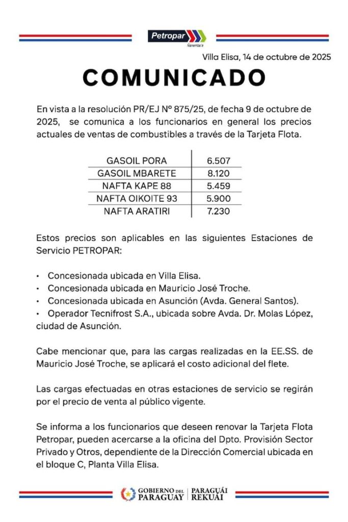 Funcionarios de Petropar recibirán descuentos especiales en la compra de combustibles, según la resolución N° 875/25 publicada el 9 de octubre de 2025.