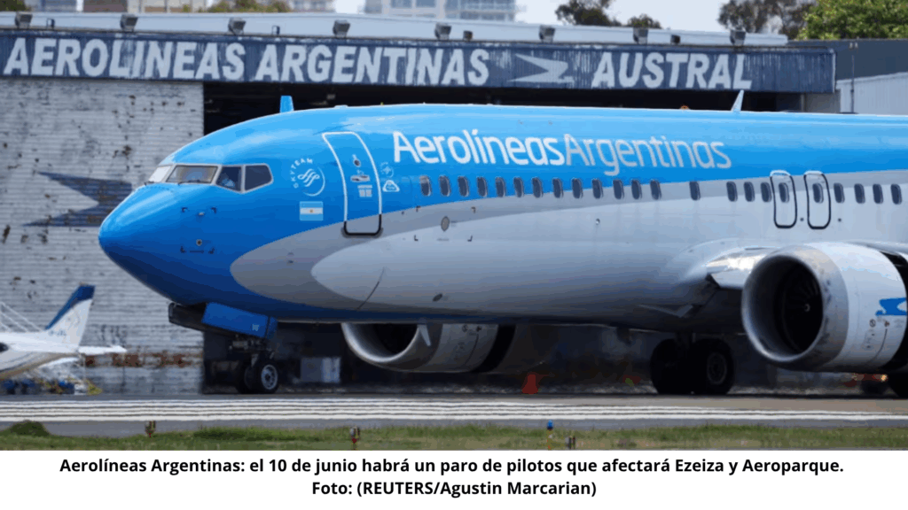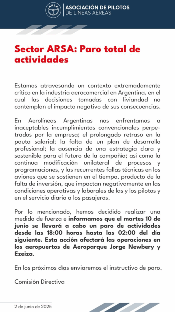 La Asociación de Pilotos de Líneas Aéreas (APLA) confirmó este lunes que llevará a cabo un paro total de actividades el próximo martes 10 de junio, desde las 18:00 hasta las 02:00 del día siguiente. La medida afectará principalmente los vuelos de Aerolíneas Argentinas en los aeropuertos Jorge Newbery (Aeroparque) y Ministro Pistarini (Ezeiza), provocando posibles demoras y cancelaciones en una franja horaria clave para el transporte aéreo nacional.