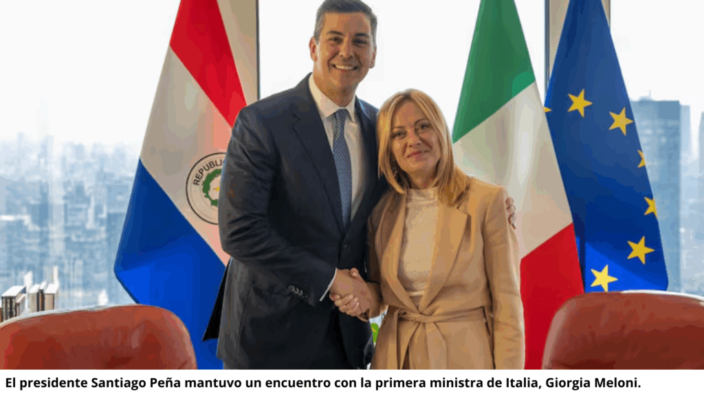 Durante su paso por Estados Unidos para asistir a la Asamblea General de las Naciones Unidas (ONU), el presidente paraguayo Santiago Peña mantuvo un encuentro con la primera ministra italiana, Giorgia Meloni, con quien revisó temas de la agenda bilateral entre ambos países.