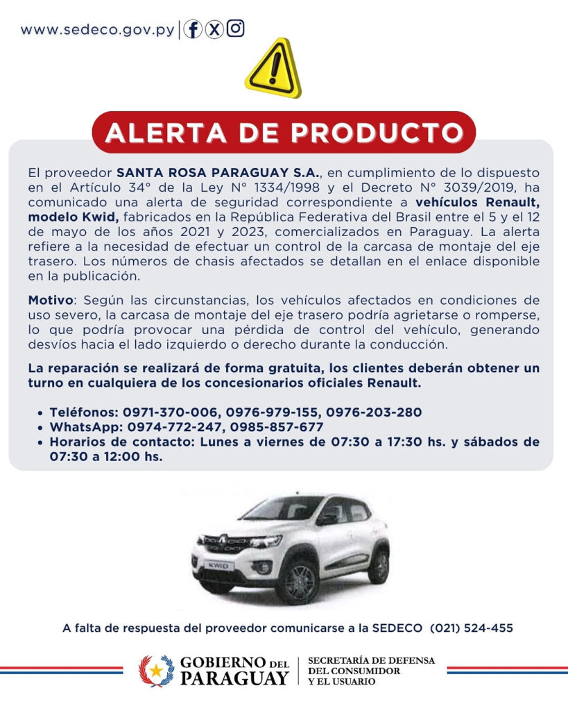 La Secretaría de Defensa del Consumidor (Sedeco) emitió una alerta de producto tras recibir información de Santa Rosa Paraguay S.A., representante oficial de Renault, sobre un problema detectado en el modelo Kwid.