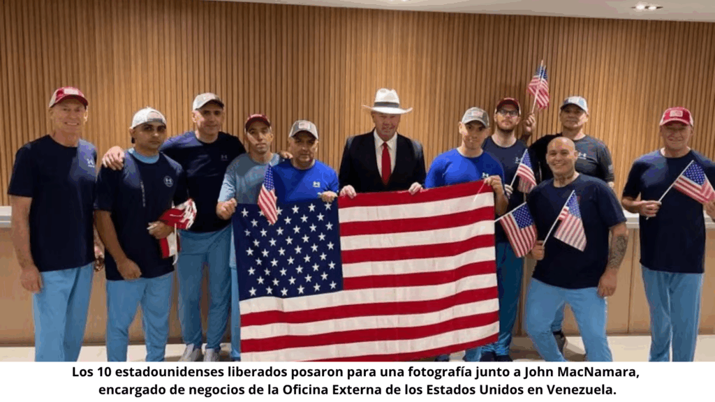 La Oficina Externa de EE.UU. para Venezuela compartió una fotografía de los liberados, afirmando que “Nada representa la libertad como la bandera de los Estados Unidos”.
