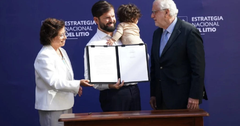 El presidente chileno, Gabriel Boric, encabezó este jueves en el Palacio de La Moneda la firma de la actualización del Contrato Especial de Operación de Litio (CEOL) en el Salar de Maricunga acompañado de su hija Violeta, de siete meses.